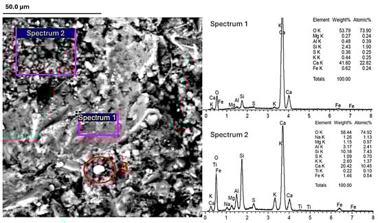 Needle-like formations (25–30 μm) were identified in the 2-day cured reference sample. While the morphology does not correspond to the most frequently observed hexagonal one on the aggregate/matrix interface, likely due to the reduced porosity, the chemical composition, consisting almost entirely of calcium and oxygen (50.74% and 44.71%, respectively), suggests the presence of portlandite (Ca(OH)2), which results from the hydration of cement and represents the beginning of hardening reactions. Additionally, the formation of cement gel confirms active hydration processes. In the lapillus-containing sample, two distinct gel types were identified based on EDS spectra and differing elemental proportions. In the case of the dense area, this could be an area free of lapillus as the percentage composition consists entirely of calcium and small percentages of other components (Figure 7, Spectrum 1). In the more granular region (Figure 7, Spectrum 2), it is possible to identify areas with a higher concentration of Iron. In fact, from the spectrum it can be seen that the Ca/Si ratio is approximately 6 and that there is an increase in the content of iron (1.46%) and potassium and magnesium (2.60% and 1.15%, respectively) compared with the eds analysis of the previous region, these being the elements that characterize the composition of lapillus after silicon and aluminum, which are also present in large quantities in the cement powder. The sample containing 20% lapillus is characterized by two different types of gel (one related to chemical analysis of spectrum 1 and one related to chemical analysis of spectrum 2) since they have the same elements but in different proportions. In any case, it is not possible to clearly discern the presence of lapillus in the form of grains, since it reacted within the mixture to form cement gel. In Figure 7 it is also possible to distinguish a white granule that for composition and size could be a grain of unreacted clinker (C2S–C3S).