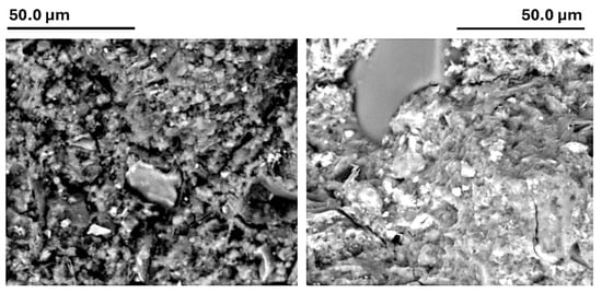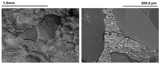 The sample with a higher percentage of lapillus, aged 28 days (Figure 9, right), is very dense, homogeneous, and well bound to the sand grains, compared with the sample aged 2 days, as shown in Figure 9 (left).