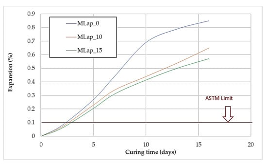 Expansion deriving from the alkali–silica reaction for samples containing 0, 10, and 15 wt% of lapillus.
