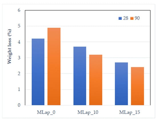 The results obtained on compressive strength are consistent with the data reported in the literature on the substitution of raw materials of volcanic origin for the production of mortars or blended cements: compressive strengths tend to decrease as the percentage of substitution increases. This is linked to the fact that the development of the mechanical properties in mixed compositions tends to be delayed [,] due to the slowness of the pozzolanic reaction [,]. It is, however, important to underline that despite the low amount of amorphous phase in lapillus, an almost comparable strength is obtained just after 90 days of curing (MLap_0 = 47.00 MPa and MLap_10 = 44.57 MPa). Cement hydration tends to be delayed as the lapillus content increases, and the active material in silicon and aluminum is lower than in the reference sample. However, it should be noted that blended cements tend to increase their mechanical strength in the long term when the pozzolanic reaction reaches its completion as recorded in this case.