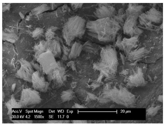 As for the sulfate penetration tests, it is possible to say that after 15 weeks of curing in the sulfate solution, the dimensional changes of the unmodified mortar related to the formation of expansion products are still low but higher than those found in mortars containing lapillus. Initial ettringite formation was detected in the unmodified mortars, as shown in Figure 14.