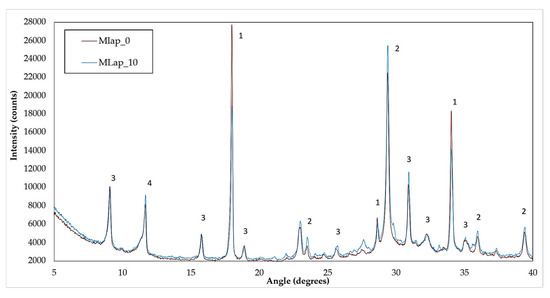 X-ray analysis of MLap_0 and MLap_10 at 90 days of curing (1, portlandite; 2, calcium carbonate; 3, ettringite; 4, monocarbonate).
