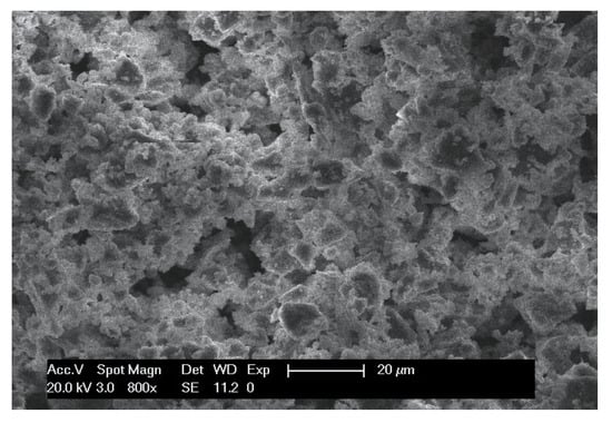 - Volcanic lapillus scrap, effusive magmatic material (Pleistocene Vulsine volcanite) from quarries located in the province of Viterbo (Latium, Italy) naturally calcined at a high temperature, resulting from explosive volcanic eruptions that occurred as a result of the expansion of dissolved gases into acidic lavas []. Chemical analysis of the lapillus showed SiO2 and Al2O3 contents of 49.1% and 18.3%, respectively, as well as CaO content of 9.27% and Fe2O3 content of 9.15%, while MgO, Na2O, and K2O contents were 4.25%, 2.35%, and 3.66%, respectively [,,]. Lapillus scraps, which were initially less than 3 mm in diameter, were ground in ball-miller (MMS, Nonantola (MO), Italy) for 5 min in order to obtain an average particle diameter of less than 100 μm in order to increase their reactivity and compatibility with clinker and also to homogenize the waste. The dimensional distribution is D10 = 2.1 µm, D50 = 19.8 µm, and D90 = 60.1 µm. Figure 16 shows the morphology of the powders obtained by scanning electron microscopy (ESEM-Quanta 200, FEI).