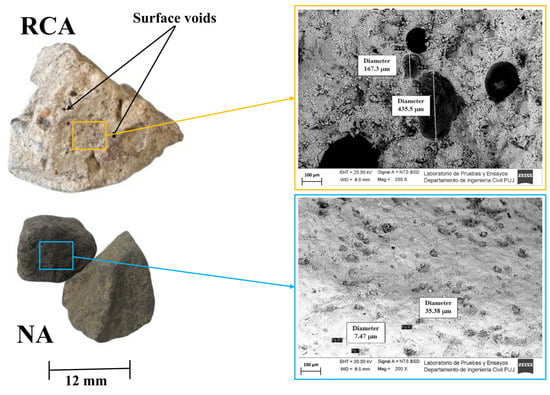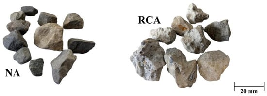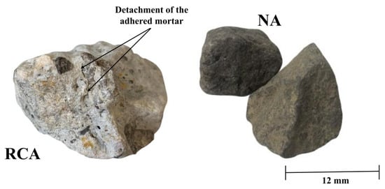 The main advantages of using RCA in HMA production lie in their shape and cleanliness characteristics. RCA typically exhibits a cubic shape, resulting from the crushing and size reduction processes involved in recycling, which contributes to improved particle interlocking and enhanced stiffness of the HMA [37]. Microscopic images have shown that RCA has a higher surface roughness compared to NA, primarily due to the presence of adhered mortar [2,38]. Additionally, RCA generally meets the cleanliness requirements for HMA production; however, washing and drying are recommended to remove fine particles that could negatively affect asphalt adhesion [39]. The main disadvantages of RCA in hot mix asphalt (HMA) lie in the adhered mortar, which is characterized by low density, high porosity, and a tendency to detach and fracture easily due to its brittleness [40,41], as well as the need for a higher asphalt content. The adhered mortar accounts for approximately 30% to 35% of the total mass of RCA [42], which may lead to higher wear in tests such as the Los Angeles abrasion test, the micro-Deval test, and the soundness test.
