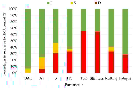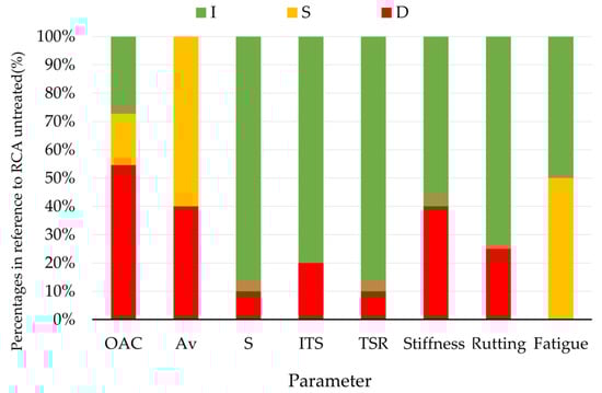 In summary, considering all the reviewed studies on mixtures with treated RCA, Figure 6 presents the variations (I, D, or S) in the evaluated parameters relative to untreated RCA. In general, surface treatments tend to reduce or maintain similar values of optimum asphalt content (OAC) and air voids (Avs). Furthermore, the reviewed studies show greater improvements in the evaluated parameters compared to mixtures containing untreated RCA.