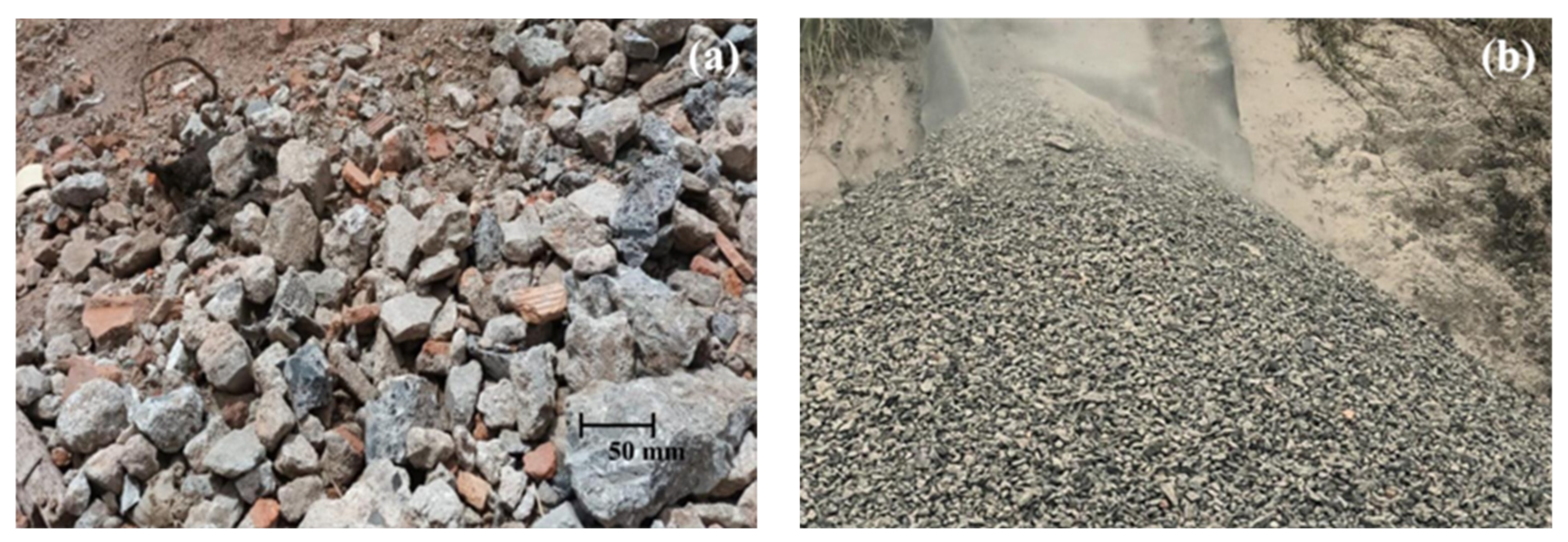 - Jayakody, S.; Gallage, C.; Kumar, A. Assessment of Recycled Concrete Aggregates as a Pavement Material. Goemech. Eng. 2014, 6, 235–248. [Google Scholar] [CrossRef]