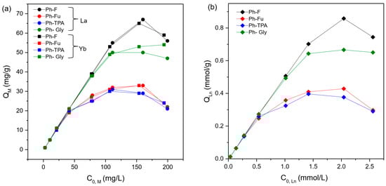 The adsorption isotherms of the resins (Ph-F, Ph-Fu, Ph-TPA, and Ph-Gly) for a mixture of La and Yb in acetic acid (0.1 M, pH = 2.8) at V/m = 0.5 for 16 h at 25 °C. (a) The capacity for each metal (M = La or Yb) expressed in mg/g; (b) the capacity for both metals (Ln = La and Yb) expressed in mmol/g.