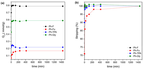 Kinetic studies were performed for the sorption and desorption of a mixture of La and Yb, as previously performed for the isotherms. The adsorption process was meticulously monitored by observing the immediate effect of the acetic acid solution on the activated resins. This observation continued for a period of one day, as depicted in Figure 3a. All materials exhibited rapid kinetic exchange for cations (Na to Ln), yet certain observations merit attention. It was observed that Ph-F and Ph-Gly achieved equilibrium within ten minutes. However, Ph-Fu exhibited a slight slowdown prior to reaching the plateau, while Ph-TPA demonstrated a modest decline in adsorption capacity. Nevertheless, equilibrium was achieved for all materials after two hours (black dashed line), with no significant differences observed in the La and Yb concentrations.