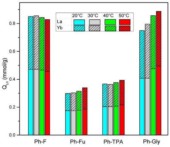 In order to assess the influence of temperature on the adsorption process, extraction experiments were conducted with a mixture of La and Yb in acetic acid at temperatures ranging from 20 °C to 50 °C (Figure 4). After a two-hour period, no substantial alterations were detected, except in the case of Phy-Gly, where a slight increase as temperature rises in terms of adsorption capacity or selectivity between light and heavy REEs was observed.