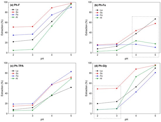 As was previously demonstrated in the sorption isotherm analysis at a pH of 2.8, the extraction percentage exhibited the following sequence: Ph-F ≥ Ph-Gly >> Ph-TPA ≥ Ph-Fu. Extraction at pH values of 4 and 5 resulted in a substantial enhancement of extraction, as illustrated in Figure S12. It has been demonstrated that all of the resins exhibit the capacity to extract metal at a rate that is twice that of Ph-Fu and up to four times that of the other materials at pH = 5. This trend in extraction capacity can be attributed primarily to the decline in H+ concentration, leading to a reduction in the competition between the protonation of activated alcoholate function and metal chelation. Furthermore, acetic acid has a pKa constant of 4.8. Consequently, a mixture of acid and acetate exists at a pH of 4–5. This significantly impacts the selectivity between the four metals in solution (Table S2). The observed alterations can be attributed to the thermodynamic constant of metal–acetate complexes, which exhibit significant variation. This variation has a substantial impact on the selectivity of the system when the pH of the solution is altered. Notably, two resins have been identified as being particularly noteworthy within the range of pH values examined (Table 2). The Ph-Gly adsorbent demonstrates notable efficacy in extraction operations conducted at pH values ranging from 2 to 3, exhibiting a separation factor of approximately 3. This performance is particularly evident in the context of SFLa/Fe, which is observed to be lower in comparison to alternative resins. The adsorbent Ph-Fu exhibits remarkable efficacy in the separation process at pH values ranging from 4 to 5, exhibiting a substantially higher SF compared to other adsorbents, particularly SFLa/Fe, with an SF value exceeding 16 at a pH of 5.