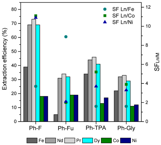The extraction efficiencies and selectivities obtained with the different sorbents are summarized in Figure 6. The sorbent Ph-F demonstrated high extraction efficiencies for REEs (approximately 70%), along with strong selectivity for lanthanides over cobalt and nickel, with selectivity factors (SFLn/Co and SFLn/Ni) of 11.1 and 10.9, respectively. Additionally, it exhibited an iron selectivity of SFLn/Fe =3.7. Conversely, Ph-Fu exhibited moderate extraction of lanthanides, with efficiencies approaching 30%, and notably diminished selectivity, as evidenced by SFLn/Co and SFLn/Ni values of 2.0 and 2.1, respectively. However, its selectivity towards iron is much more pronounced, with a value of 8.9. The Ph-Gly sorbent exhibited balanced performance, achieving moderate REE extraction (approximately 50%) and exhibiting good selectivity over iron, with a selectivity factor SFLn/Fe of 5.2. The extraction efficiencies of Ph-TPA were found to be marginally lower than those of Ph-Gly. However, Ph-TPA demonstrated acceptable selectivity, particularly in the context of cobalt (SFLn/Co = 3.9). Across all sorbents, iron consistently exhibited lower extraction, thereby underscoring the observed sorbents’ preference for lanthanides over transition metals. These findings highlight the potential of the sorbents in developing efficient separation process for REEs from complex metal mixtures such as an acetic acid leachate of permanent magnets.