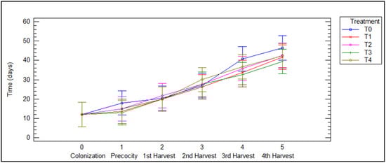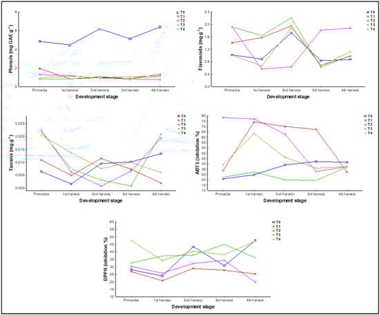 P. djamor basidiomas were observed to vary among treatments; BE progressively decreased from T0 (106.5%) to T4 (33.16%). Treatments with higher amounts of agave bagasse (T4) generated firmer fungi, with a fracture toughness of 7.06 ± 3.06 newtons. During fungal development, phenols, flavonoids, and tannins fluctuated. Treatment T0 showed the highest concentration of phenols (5.41 ± 0.92 mg GAE g