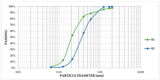 Sifting of S1 and S2 was carried out according to SNPA/18 2018 [46]. Moreover, washing treatment indicated that the sediments were solid particles purely in the sand range. Specifically, 90% of samples S1–S2 were in the fine–coarse sand range (0.063–0.6 mm) and the remaining 10% in the very coarse sand range (0.6–2 mm) according to the Udden–Wentworth scale [47,48], with a D50 of 0.35 and 0.2 mm for samples S2 and S1, respectively (Figure 1).