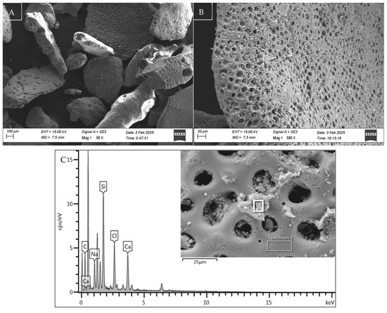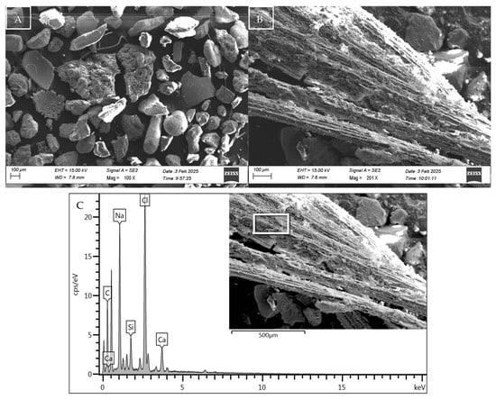 As illustrated in Figure 3C, the spectrum of sediment particle S2 demonstrates a convergence of the representative peaks of the EDX analysis with the mineralogical composition of the sediments in the area under study, particularly the southern portion of the Adriatic Sea. As evidenced by Lucchini et al. 2003 [49] and by the data of the oceanographic campaign ‘PERTRE’ (one of the European ‘PERSEUS’ project missions) carried out by the Italian Institute for Marine Biological Resources and Biotechnology (IRBM-CNR) in 2016, there is confirmation of the reduced organic content shown in the characterisation data of Table 1.