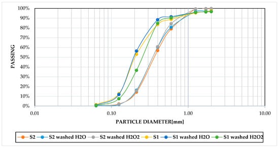 The chemical–physical analysis of the samples subjected to washing and oxidation treatments indicated a progressive reduction in volatile/organic fraction (Table 2). Indeed, samples S1 and S2, which underwent washing with H2O, exhibited 15% and 13% reductions of the indicated fraction, respectively. Moreover, after washing with an oxidiser, the maximum reduction was observed at 40% and 31.5%, respectively. After the treatments with H2O and H2O2, the grain size distribution was examined, and the data were compared to the initial condition. The most notable alteration was observed in sample S1 following the oxidation washing with H2O2, which indicated a slight reduction in the proportion of medium-sized sands (0.6–0.2 mm) and an increase in the finer fraction (0.2–0.063 mm) with a representative D50 of 0.28 mm. This particle size distribution is presumably correlated to the variation in organic content within the sample under study (Figure 3). In contrast, the variations of the particle size distribution following the treatments on sample S2 are not significant (Figure 4) because of the low organic content, so the D50 was constant following the treatments.