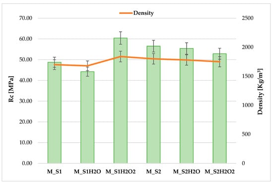Overall compressive strength test trend for cement mixes produced from sediment samples S1–S2 and washed with H2O and H2O2.