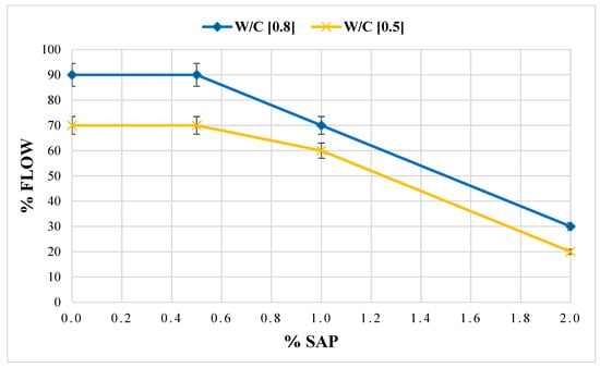 Flow test performance of cement mortars with SAP at varying mix quantities and w/c ratio 0.8–0.5.