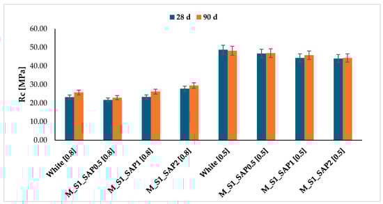 Samples with a water/cement ratio of 0.5 showed values in the same range as the reference, but with a declining trend at increasing SAP concentration. This phenomenon can be attributed to the capture of water available in the mortar, which consequently limits the hydration reactions and, in turn, the compressive strengths after 28 days of curing. This effect was observed for a water-to-cement ratio of 0.5, in contrast to that of 0.8, due to lower water content (Figure 9 and Table 4).