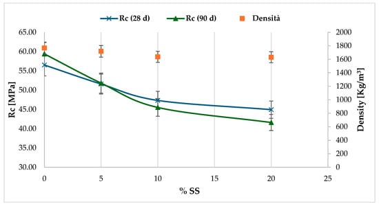 The effects of sodium silicate in cementitious mortars were studied uniquely on sample S2, with a lower organic fraction. As observed, this tends to reduce the development of hydration reactions and, consequently, the resulting mechanical performance of conglomerates (Table 5).