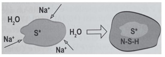 The reduction in strength observed in mortars containing sodium silicate can be attributed to the chemical reaction between alkali introduced by the additive and the silica present in the sediment (reaction between silica and alkali in the moisture (4)) [60]. The alkali-silica reaction (ASR) is a chemical phenomenon that causes the aggregate to expand due to the formation of a viscous gel, which increases its volume by water absorption , as shown in Figure 11. This increase in volume generates expansive pressure within the silica aggregate or at the interface between cement paste and aggregate, resulting in a loss of stiffness and strength.