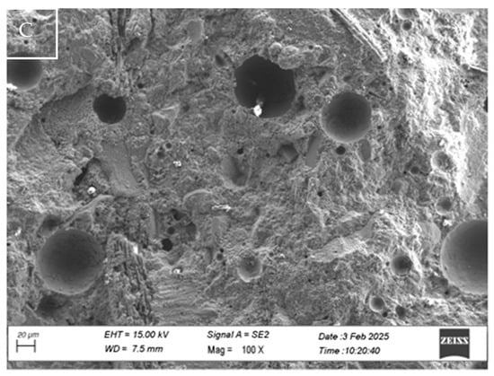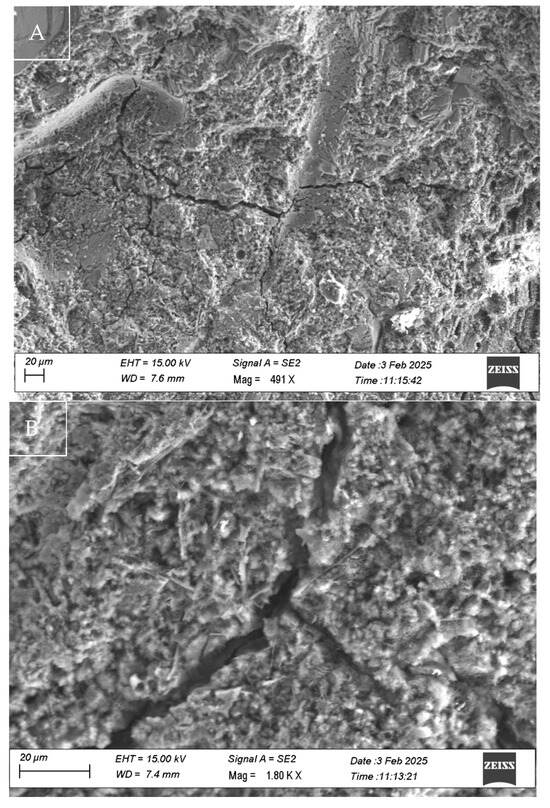 Microstructural analyses of sample M_S2_SS10, particularly relevant due to the loss of mechanical properties, revealed the presence of micrometre-scale fractures within the cementitious matrix. This discontinuity at the matrix level, developed in the mortars where the sodium silicate-based additive was added, confirms the critical issues identified in the mechanical compressive strength tests. In contrast, for the mortar sample with 5% SS (M_S2_SS5), the negative influences in terms of mechanical strength are lower, as shown by the Rc data in Table 5, and this is confirmed at the microscopic level (Figure 12C) where no fractures are present within the matrix.