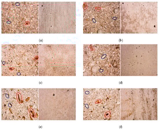 Detail of structure of mechanically tested specimens, specifically, the cutting face (left) and outer surface (right) of the specimens are visible, respectively M_S2 (a), M_S1H2O2 (b), M_S1_SAP2.0 [0.8] (c), M_S2_SS10 (d), White [0.5] (e), M_S1_SAP0.5 [0.5] (f) at 28 days of ageing.