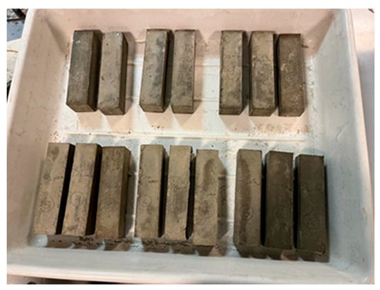 After flexural fracture, each mortar sample was subjected to compressive stress tests per UNI EN 196-1:2016 [68]. Thereafter, the characteristic compressive strength value, designated as Rc, was calculated using the methodology outlined in Equation (8):