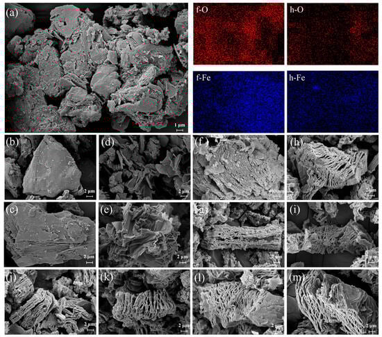 SEM of (a) SG, (b) FJH-80, (c) HTT-1200, (d) GO-FJH, (e) GO-HTT, (f) EG-Fe3+-FJH, (g) EG-Fe3+-HTT, (h) EG-Fe2+-FJH, (i) EG-Fe2+-HTT, (j) FF70-Fe3+, (k) FF90-Fe3+, (l) HF70-Fe3+, (m) HF90-Fe3+.