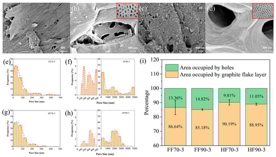 SEM of (a) FF70-3, (b) FF90-3’s local morphology (and overall morphology in the red box), (c) HF70-3, (d) HF90-3’s local morphology (and overall morphology in the red box). Pore size distribution plots for the following four samples: (e) FF70-3, (f) FF90-3, (g) HF70-3, (h) HF90-3, (i) the ratio of the holes in the four samples of FF70-3, FF90-3, HF70-3, and HF90-3 to the surface area of the graphite flake layer, and the number of samples N = 5.
