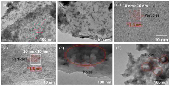 Figure 3 presents some TEM images of more microscopic structures to complement the deficiencies of the SEM images. Comparative examination of Figure 3a–d reveals distinct iron oxide nucleation patterns dictated by precursor chemistry. Iron (III) acetate-assisted hydrothermal treatment (Figure 3a,b) promotes the conspicuous formation of nano-scaled iron oxide particulates uniformly dispersed across graphene lamellae, exhibiting well-defined crystalline interfaces with carbon matrices. In contrast, iron (II) acetate systems (Figure 3c,d) generate significantly refined nanoparticles, with EG-Fe2+-FJH and EG-Fe2+-HTT measuring approximately 1.3 nm and 1.8 nm, respectively—dimensions approaching quantum-confined regimes. As shown in Figure S3, iron (II) acetate composites (EG-Fe2+-FJH/HTT) present featureless diffraction patterns despite confirmed nanoparticle existence via TEM characterization. This apparent paradox arises from nanoscale confinement effects: critically diminished crystalline domains induce extensive peak broadening that obscures discrete Bragg reflections, causing diffraction signatures to dissipate into the amorphous background continuum [33]. It is found that, whether iron (II) acetate or iron (III) acetate is used as the iron source, the attachment density of metal oxides on the graphite layers is greater when using GO-FJH as the hydrothermal raw material in comparison to GO-HTT. Combined with the previous analysis in the SEM section, this further verifies from another side that the oxidation degree of GO-FJH is higher.