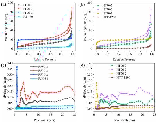 Isothermal adsorption and desorption curves of (a) flash Joule heating series: FF70-3, FF90-3, FF70-2, and FJH-80, (b) High-temperature treatment: HF70-3, HF90-3, HF70-2, and HTT-1200. DFT Pore size distribution of (c) flash Joule heating series: FF70-3, FF90-3, FF70-2, and FJH-80, (d) High-temperature treatment: HF70-3, HF90-3, HF70-2, and HTT-1200.