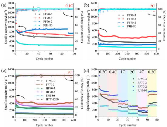 Under high-rate discharge conditions (2C), as shown in Figure 5b, the specific capacities exhibit significant variation, exhibiting 237 mAh g−1 for FF90-3, 419 mAh g−1 for FF70-3, 181.9 mAh g−1 for FF70-2, and 98.1 mAh g−1 for FJH-80. Compared with FF70-2 treated with iron (II) acetate, FF70-3 treated with iron (III) acetate exhibits better performance, which is primarily attributed to the rich mesoporous structure of FF70-3. While sub-2 nm pores enhance low-rate capacity through increased surface adsorption, the promotion of ion transmission is limited. In contrast, the mesoporous structure is more conducive to the transmission of lithium ions, especially under high-rate conditions. As shown in Figure S5, during the testing process, the performance of FF70-3 exhibited a fluctuating state. The fluctuations were modest and consistent with stochastic wetting in porous carbons.