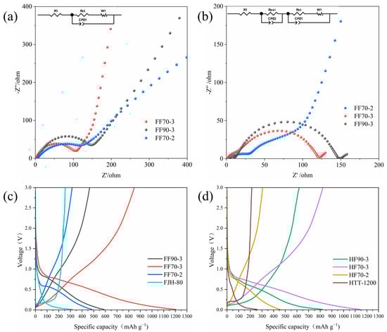 Electrode reaction kinetics were rigorously interrogated through electrochemical impedance spectroscopy (EIS), revealing fundamental correlations between pore architecture and charge transfer dynamics. As shown in Figure 6a, the composite designated FF70-3 exhibits minimal interfacial charge transfer resistance (Rct). It signifies optimized reaction kinetics at the electrode-electrolyte interface. These enhancements originate in the material’s hierarchical mesoporous architecture, which establishes efficient ionic percolation pathways that dramatically reduce lithium-ion diffusion lengths while preserving structural continuity of the conductive network. Through the fitting and analysis of ZView3 software, comparative analysis identifies FF70-2 exhibits intermediate impedance characteristics, with an Rct of 141.6 Ω. While its ultra-high specific surface area derived from nanoscale porosity provides abundant lithium adsorption sites, the diffusion pathways are constrained to impede lithium-ion penetration into graphitic interlayers [38]. The most pronounced impedance occurs in FF90-3, with an Rct of 177.4 Ω, where 90V FJH triggers destructive structural evolution. Excessive thermal energy input during high-voltage etching probably induces carbon lattice fragmentation, generating macropores that disrupt the intrinsic conductive network through graphene sheet disconnection. This irreversible damage creates electron transport bottlenecks, particularly evident in the middle-frequency semicircle expansion. The compromised electrical percolation pathway fundamentally limits charge transfer efficiency.