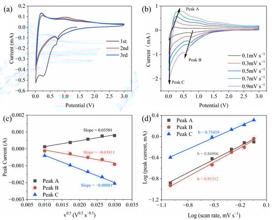 CV curves of (a) the first three cycles at 0.1 mV s−1 scan rate for FF70-3 and (b) FF70-3 at 0.1, 0.3, 0.5, 0.7, 0.9 mV s−1 scan rates. (c) The fitting curves based on ν1/2 and peak current from CV results at different sweep rates. (d) Log(i) versus log(v) at peak A, peak B, and peak C.