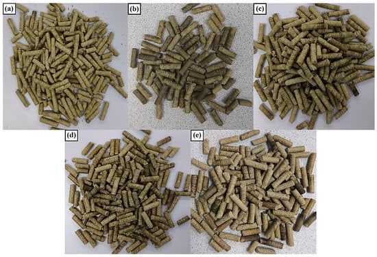 Corncob and RH pellets using a 6 mm flat die: (a) CC100; (b) CC70:RH30; (c) CC50:RH50; (d) CC30:RH70; (e) RH100.
