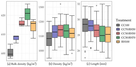 Additionally, Figure 2c showed length results with significant variation according to the pellet formulations. The CC100 and CC70:RH30 treatments yielded pellets with the highest median lengths, indicating that pellets produced with corncob or a higher proportion of corncob tend to be longer. In contrast, treatments with higher RH content, such as CC30:RH70 and RH100, exhibited slightly shorter median lengths and greater dispersion. Despite these differences, lengths remain within a relatively narrow range (approximately 26–32 mm), which is acceptable for commercial pellets.