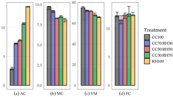 Figure 4 showed that the CC100 pellets have significantly lower ash content (AC) values compared to the RH100 pellets (p < 0.05). Ash content is a critical parameter for fuel quality because high levels can decrease combustion efficiency and promote fouling in combustion systems [42]. The values range from around 3% for CC100 to about 13% for RH100, with intermediate blends showing gradual increases consistent with the proportion of RH. Regarding moisture content (MC), RH100 had the lowest with 8.2%, statistically different from CC100. In general, the MC of all pellets was below 10%, which is favorable for storage stability and combustion performance. CC70:RH30 and CC100 had the highest moisture from 9.2% to 9.8% (see Figure 4). Volatile matter (VM) content decreased slightly as the RH proportion increased, ranging from about 77% in CC100 to about 71% in RH100, which could influence ignition and burnout behavior. Fixed carbon (FC) values were relatively constant across treatments, between 10% and 11%, indicating that blending did not substantially affect this parameter.