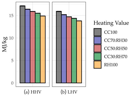 Figure 5 presents the heating values of the lignocellulosic pellets evaluated. CC100 exhibited the highest higher heating value (HHV) at 17.05 MJ/kg (p < 0.05), followed by CC70:RH30, CC50:RH50, and CC30:RH70, while RH100 recorded the lowest HHV at 14.89 MJ/kg. A similar decreasing trend was observed for lower heating value (LHV), ranging from 15.90 MJ/kg for CC100 to 13.80 MJ/kg for RH100. The intermediate blends showed gradual reductions in both HHV and LHV, exhibiting general additive behavior.