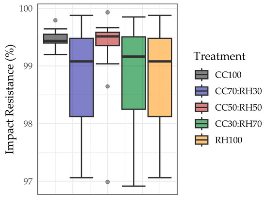 The impact resistance (IR) of the pellets for corncob and RH blending ratios is shown in Figure 7, evidencing high values between 98.7% to 99.5%, with excellent mechanical integrity under impact resistance. For all treatments, impact resistance remained above 97%, indicating high mechanical performance for handling and transport. Hence, the differences between treatments are marginal and within an acceptable range for commercial-grade pellets.