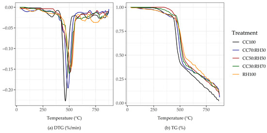 Derivative thermogravimetric (DTG) and thermogravimetric (TG) profiles of corncob–RH pellets under different blending ratios: (a) DTG (%/min) and (b) TG (%).
