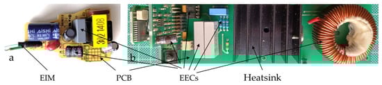 The driver typically constitutes 4–7 wt% of the equipment’s total mass [22] and facilitates the two-way ‘coupling’ between software and hardware [23], ensuring the equipment operates smoothly and safely. In general, a driver consists of electrical and electronic components (EECs), electrical insulation materials (EIMs), and printed circuit board (PCB) (Figure 1a). Depending on the type of equipment and its electrical characteristics, it may also include structures for managing the heat generated during operation, such as heatsinks (Figure 1b).