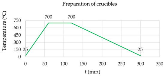 The porcelain crucibles (brand: JIPO (Jizerská porcelánka s.r.o., Desná v Jizerských horách I, Desna, Czech Republic) with a middle form), were prepared, including cleaning, initial weighing, heating, and natural cooling in a desiccator according to the heating–cooling profile shown in Figure 3, final weighing, and careful storage.