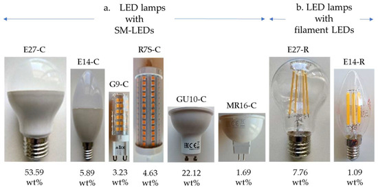 Additionally, the addition of the indicator (C) “classic” or (R) “retro” to the lamp base type denotes lamps with surface mount (SM) or filament LEDs, respectively. Figure 6 shows the mass percentage of each lamp type, based on its base and LED technology (surface mount or filament), is about the mass of the random sample in this study. The percentage ranged from 1.09 to 53.59 wt%, with E14 lamps with filament LEDs having the lowest participation and E27 lamps with surface mount LEDs (SM-LEDs) having the highest.