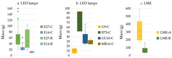 As shown in Figure 8, the mass of LE varies significantly depending on its type and technology. Specifically, Figure 8a illustrates the variation in mass of Edison-type lamps, highlighting the significant difference in mass depending on the LED technology used. Figure 8b illustrates the variation in mass among other lamps with the same LED technology, which also varies significantly depending on the lamp’s type and specifications. Figure 8c illustrates the mass difference between LME-A and LME-B, highlighting the significant variation in mass depending on the type of equipment.