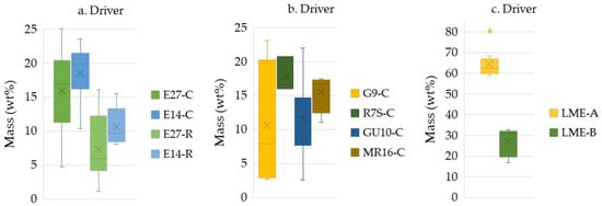 The design of the driver (Figure A3) and its percentage of the equipment’s mass (Figure 10) differed significantly depending on the type and specifications of the equipment. For lamps, using SM-LEDs, the percentage ranged from 2.58 to 25.09 wt%, with the lowest percentage found in the GU10-C type and the highest in the E27-C type. For lamps using filament LEDs, the percentage ranged from 1.16 to 16.07 wt%, with the minimum and maximum percentages found in the same lamp type (E27-R). The driver in LME-A showed an incomparably high percentage (58.74–80.39) wt% compared to all other lighting equipment examined in this study. Finally, in the case of LME-B, the driver’s percentage ranged from 16.83 to 32.69 wt%.
