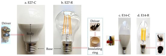 The noticeable difference in the percentage of the driver’s mass about the lamp’s mass, for lamps with the same base type (E27 or E14) but different LED technology (SMD or filament), is due to differences in lamp construction and, in particular, the position of the driver within each lamp. In lamps with SM-LEDs, the driver is located inside the lamp body; in lamps with filament LEDs, it is located inside the lamp base (Figure 11).