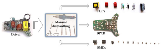 The complex structure of the drivers makes standardising a recycling process, particularly in the event of their recycling as a single structure, difficult; therefore, automatic or manual dismantling [36] and separating their components are standard practices [37]. Driver ECs can be classified according to the following: (a) their operating principle (active, passive, or electromechanical) [38]; (b) macroscopic criteria (type, colour, and geometric dimensions) [39]; and (c) the concentrations of precious metals [40], especially Au, since it accounts for approximately 80% of the total recovered value from drivers [38].