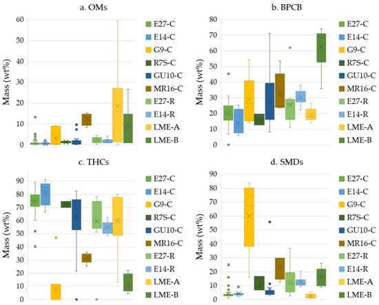 In the case of lamps, OMs consisted mainly of heat-shrinkable materials (HSMs). In contrast, OMs in LME consisted of various components, including heat sinks, electromagnetic interference (EMI) shielding, screws, electrical contacts, and various plastic structures. As shown in Figure 13a, the percentage of OMs varied significantly depending on the equipment, ranging from 0.01 to 59.45 wt%. For lamps in particular, the range was 0.01–15.23 wt%, with an average of 1.88 wt%. For LMEs, the range was 0.14–59.45 wt%, with an average of 14.81 wt%.
