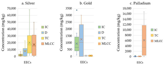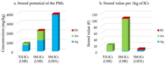 In targeted recycling, characterising EECs in terms of the concentrations of specific chemical elements in their structure is considered an essential process. The results will be used to optimise their recycling flows [27,41,42]. According to Maurice et al. (2021), targeted recycling of ECs may raise expectations for the recovery of high-value metals that are less common and found in lower concentrations in EECs than in commonly used precious metals (Ag, Au, Pd, and Pt) [43].