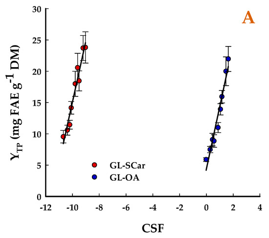 To examine whether CSF′ could be related to YTP, as previously reported [27,28,29,30], linear regressions were attempted. Figure 1 shows that for both acid and alkaline DES organosolv treatments, the values of YTP obtained were in a linear correlation with both CSF and CSF′.